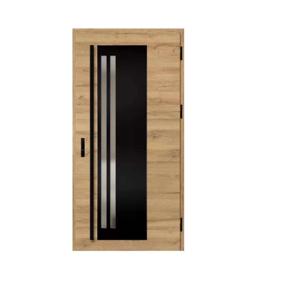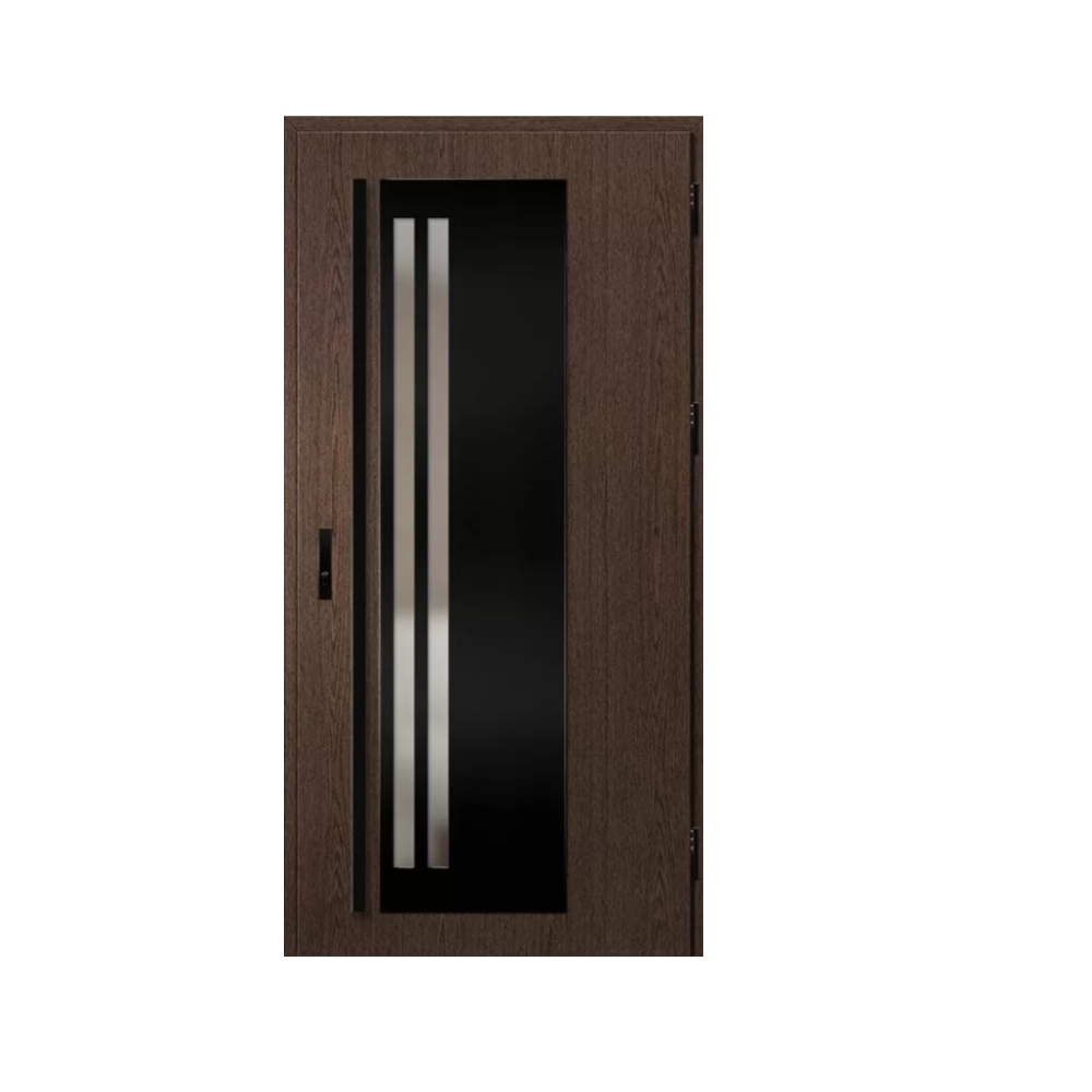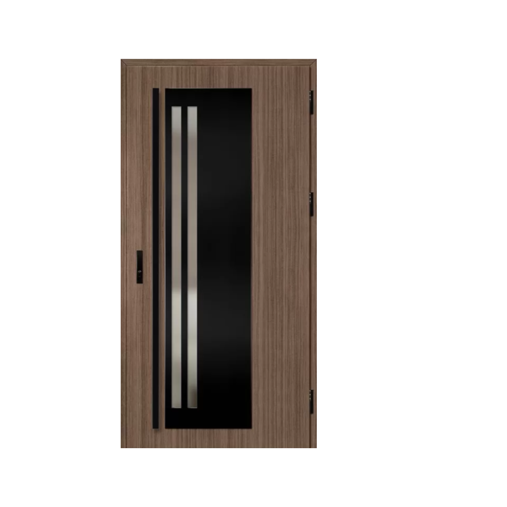 Drzwi wykonane z blachy stalowej, zabezpieczone okleiną PCV, która odznacza się wysoką odpornością na zmienne warunki atmosferyczne, promieniowanie UV i uszkodzenia mechaniczne. Faktura dostosowana do dekoracyjnego motywu tworzy produkt o wysokich walorach estetycznych.