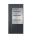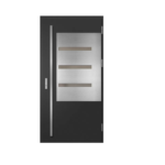 Ościeżnica aluminiowa, malowana na czarno i oklejona w kolorze skrzydła drzwiowego wyposażona w ciepły próg aluminiowy i pełną listwę zaczepową z regulacją docisku.
