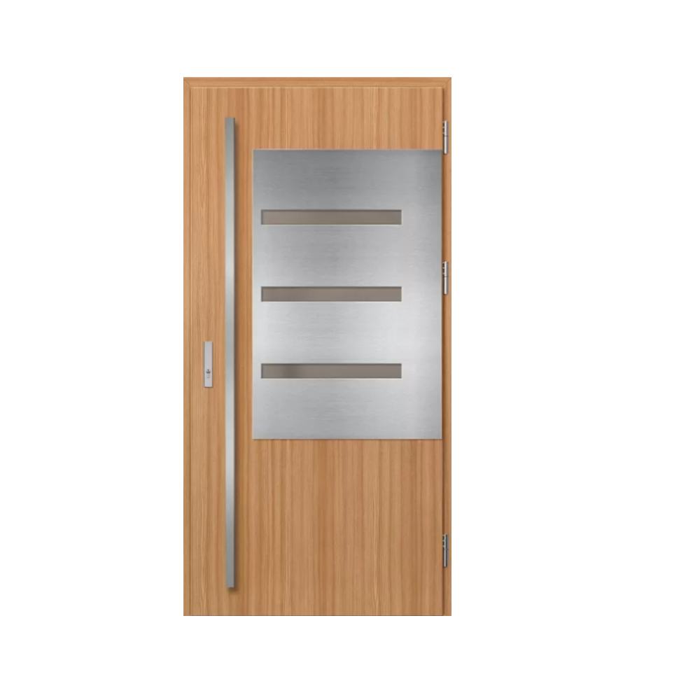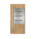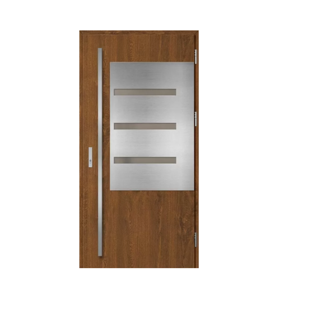 Drzwi wykonane z blachy stalowej, zabezpieczone okleiną PCV, która odznacza się wysoką odpornością na zmienne warunki atmosferyczne, promieniowanie UV i uszkodzenia mechaniczne. Faktura dostosowana do dekoracyjnego motywu tworzy produkt o wysokich walorach estetycznych.