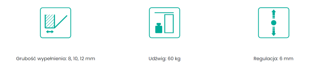 - Możliwość zastosowania tego samego rodzaju okucia do szkła o trzech grubościach: 8, 10 i 12 mm.