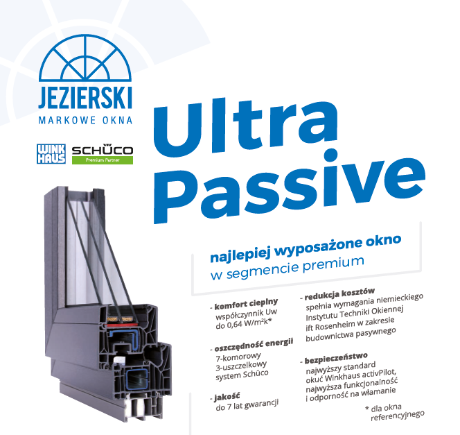 Innowacja 2016/2017 JEZIERSKI MARKOWE OKNA w branży stolarki okiennej, okna 7-komorowe. Ultra Passive to najlepiej wyposażone okno w segmencie premium. Jest nie tylko najcieplejszym oknem (do 0,64 W/m2k dla okna referencyjnego) ale także najbezpieczniejszym – antywłamaniowy narożnik wyposażony w rygiel bagnetowy zapewnia podwyższony poziom zabezpieczenia przed włamaniem. Ultra Passive to okno 7-komorowe z 3-stopniowym systemem uszczelnień. Okno specjalnie zaprojektowane do domów pasywnych. Spełnia wymagania niemieckiego Instytutu Techniki Okiennej ift Rosenheim w zakresie budownictwa pasywnego.